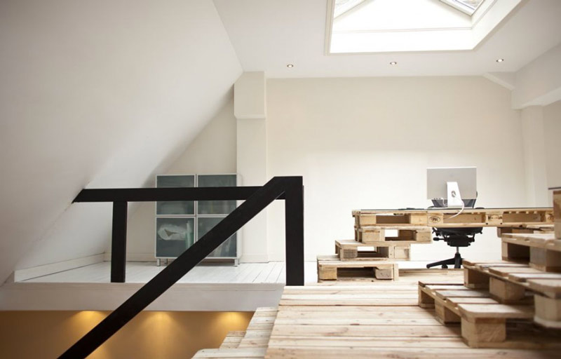 A disposição dos pallets no ambiente foi pensada para criar duas fileiras de mesas, que juntas fornecem um total de oito unidades de trabalho. Essas mesas, distribuídas em dois níveis diferentes, conferem ao escritório uma atmosfera dinâmica, onde o design flexível permite uma interação fluida entre os colaboradores. O uso de pallets para criar diferentes níveis de trabalho também mostra como materiais simples podem ser usados para introduzir elementos de design inovadores, como a variação de altura e a criação de espaços multifuncionais.